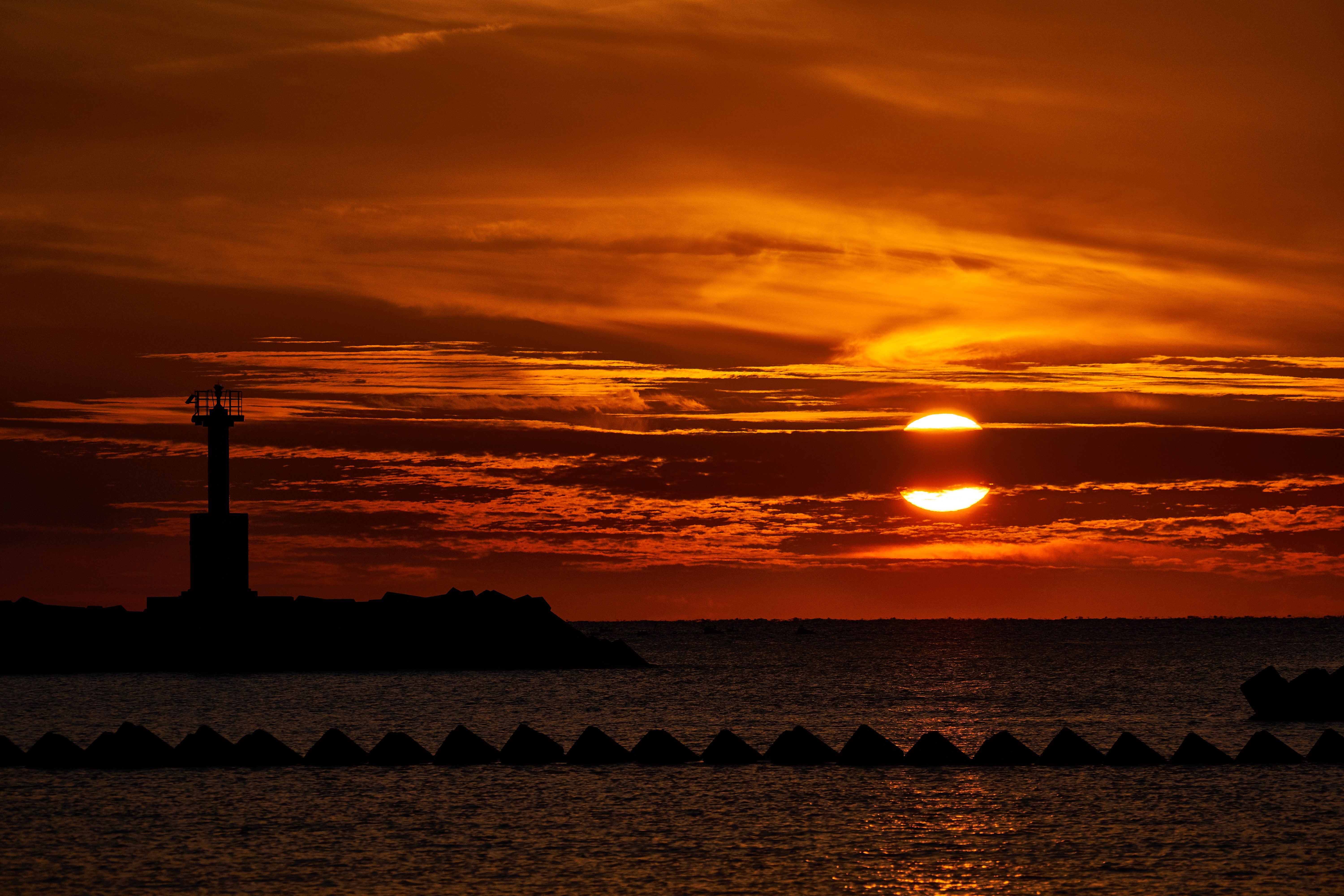 太陽が水平線に沈んでいき、刻々と変わる空と海。